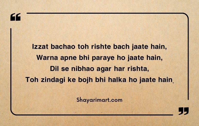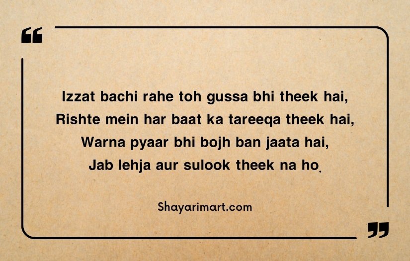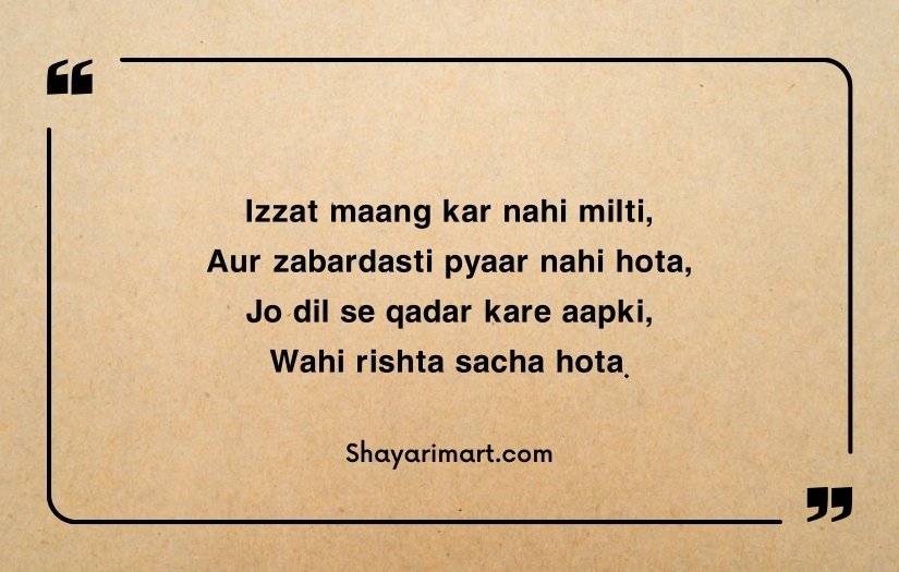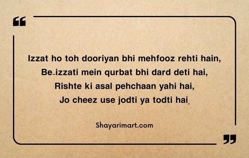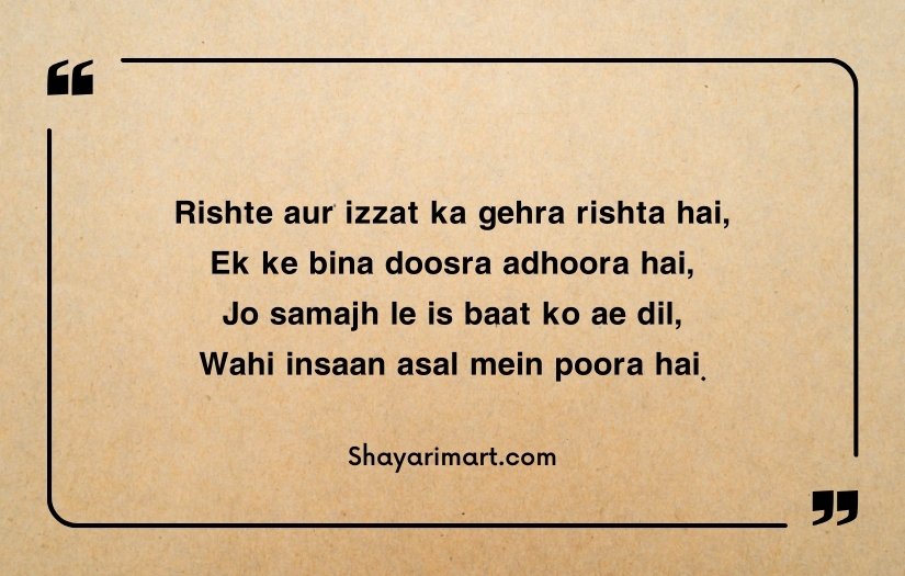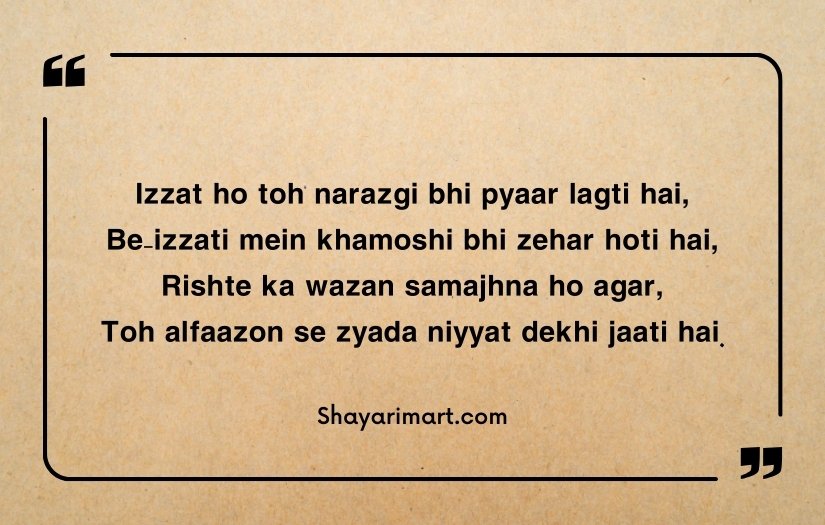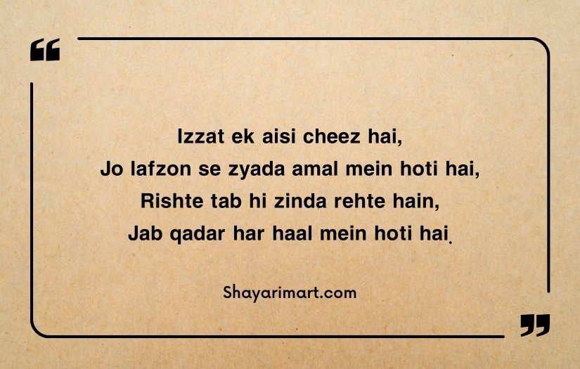 Many readers connect with rishte izzat shayari because it shows the true value of dignity in relationships. It explains how love and care lose meaning without respect and trust. Well-written rishte izzat shayari delivers strong emotional messages in simple and relatable language. These verses often encourage people to value self-respect and healthy boundaries.