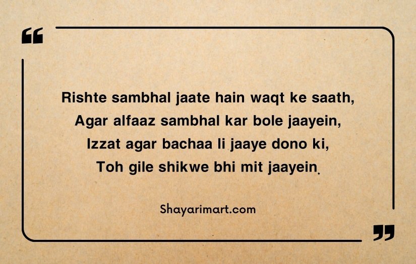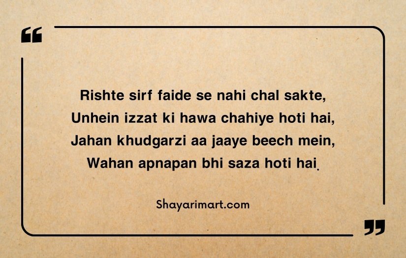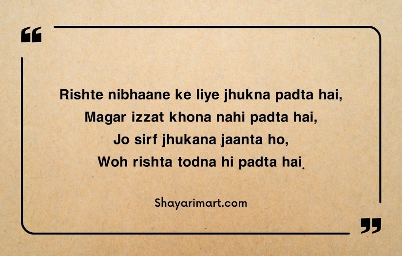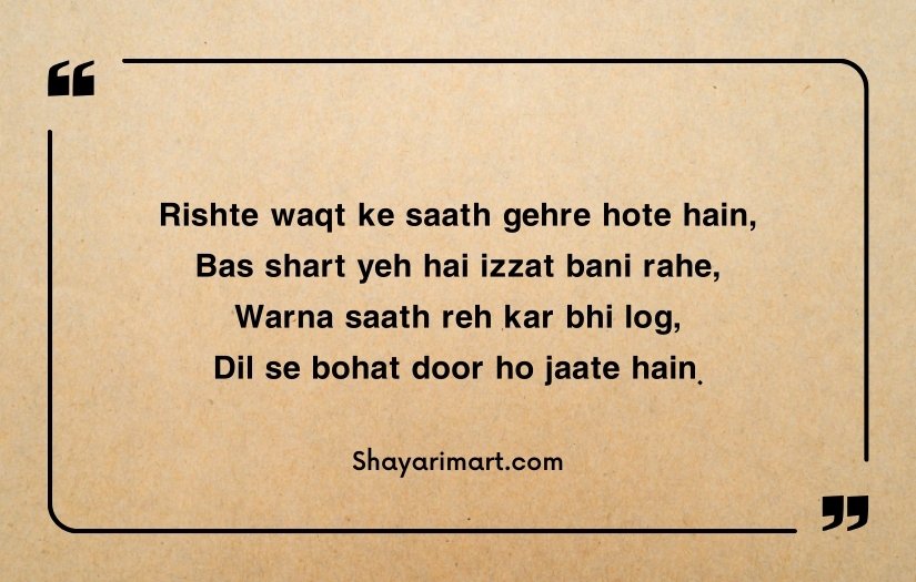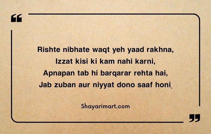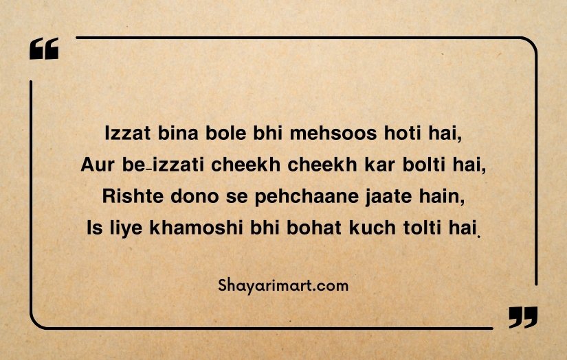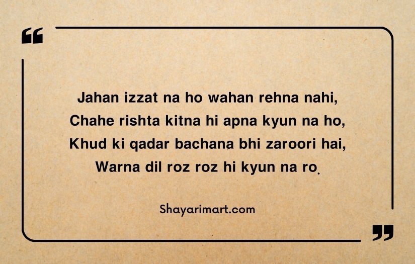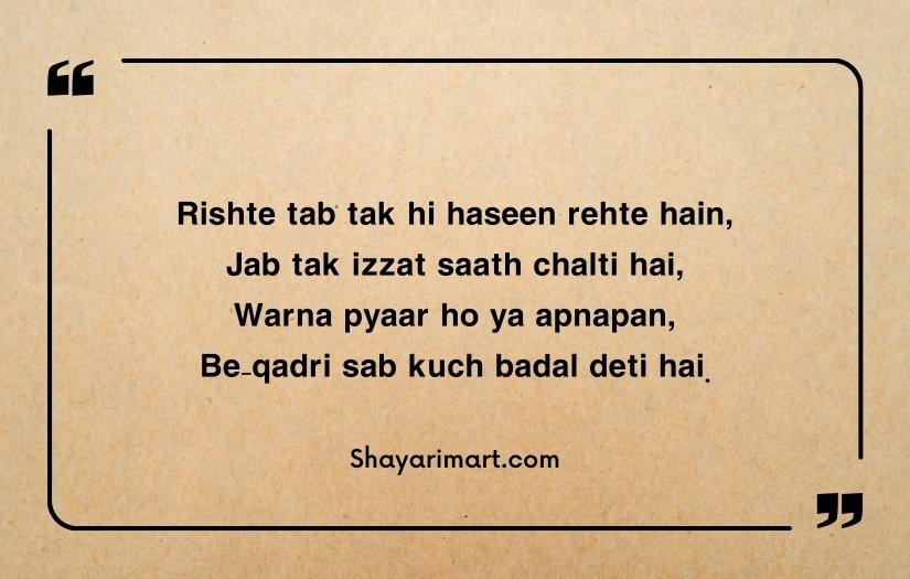 Many readers connect with rishte izzat shayari because it shows the true value of dignity in relationships. It explains how love and care lose meaning without respect and trust. Well-written rishte izzat shayari delivers strong emotional messages in simple and relatable language. These verses often encourage people to value self-respect and healthy boundaries.
