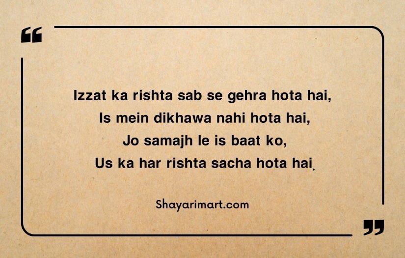 Rishte izzat shayari reflects the importance of respect in relationships and human connections. It expresses how relationships survive and grow when mutual respect, understanding, and honesty are present. Through heartfelt words, rishte izzat shayari highlights the emotional pain caused when respect is ignored or broken. This poetic expression turns real-life relationship experiences into meaningful emotions.